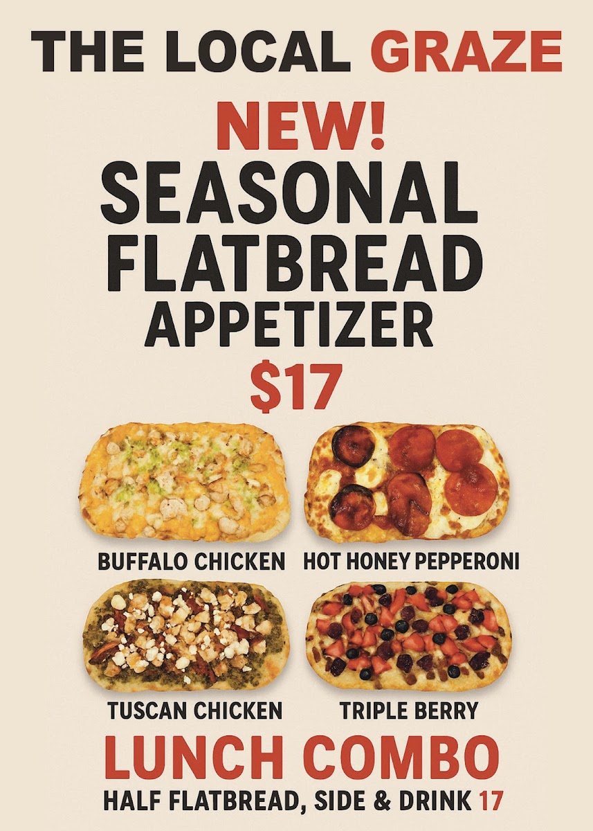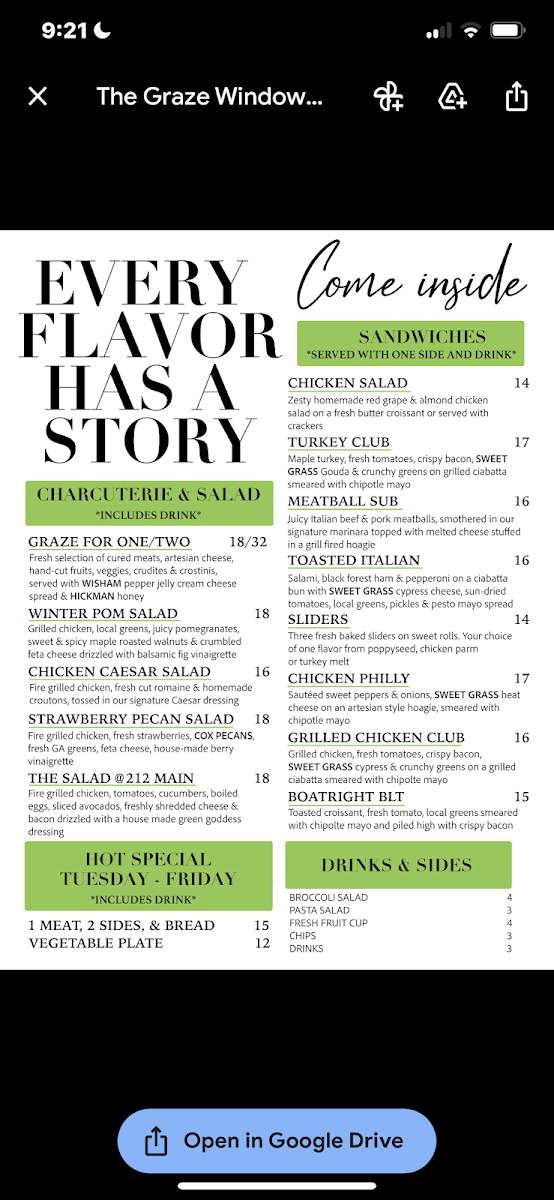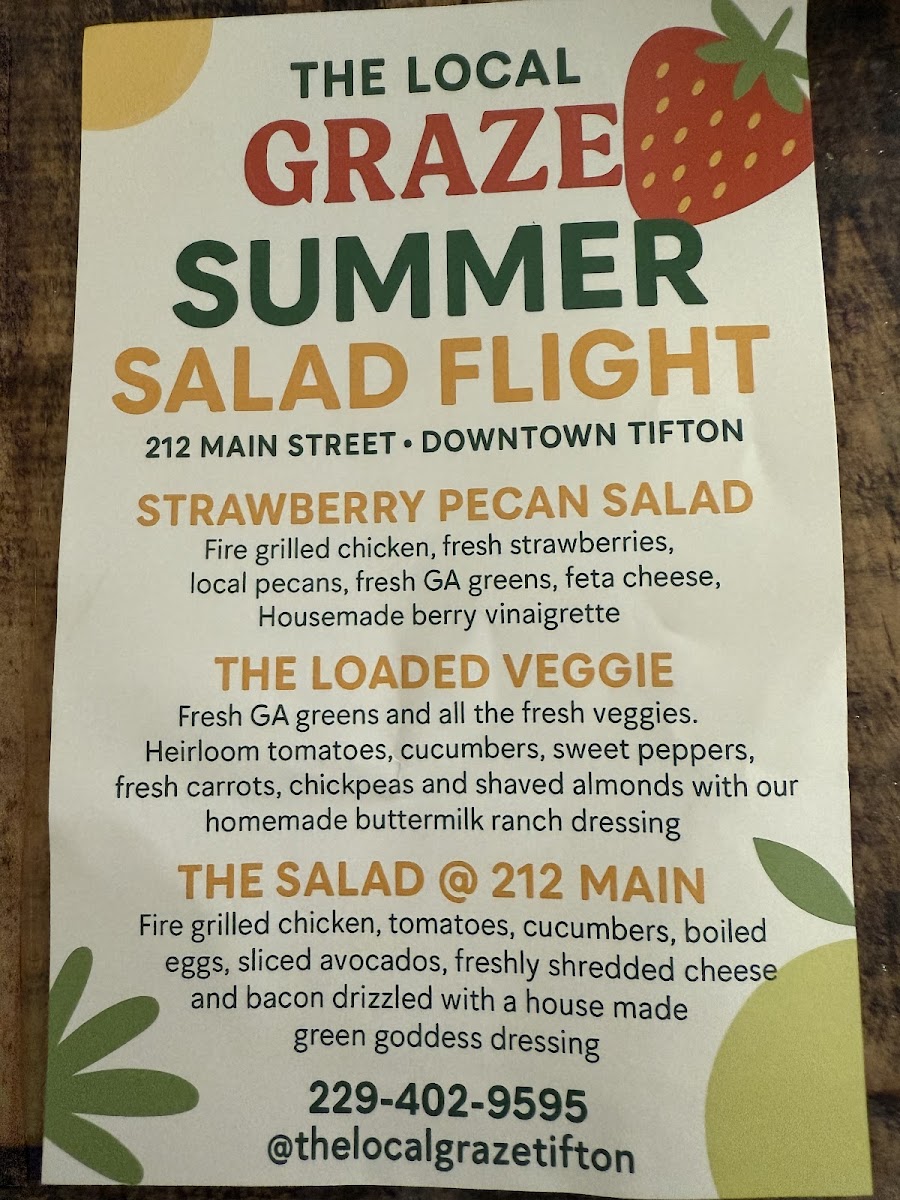 The Local Graze Tifton Menu offers a delightful variety of dishes that cater to every taste and preference, making it a go-to spot in Tifton, GA. Whether you're in the mood for something light or a hearty meal, there’s something here for everyone. Starting with the Charcuterie & Salad section, you can enjoy the Graze for One/Two, perfect for sharing or indulging solo. The Winter Pom Salad, with its festive flavors, and the fresh and vibrant Strawberry Pecan Salad are standout options for those looking for a refreshing bite. If you're in the mood for a classic, the Chicken Caesar Salad or The Salad @212 Main are satisfying choices, offering a mix of crisp greens and delicious toppings. For something more substantial, the Sandwiches menu is a must-try, featuring options like the savory Chicken Salad, the classic Turkey Club, and the mouthwatering Meatball Sub. If you're craving something a bit more indulgent, the Toasted Italian is a perfect pick, offering a toasted, crispy treat filled with rich flavors. Don’t miss out on the Sliders, a fun and flavorful option that's great for sharing or enjoying as a smaller meal. The Hot Specials served Tuesday through Friday are a highlight, offering a choice of one meat, two sides, and bread, making it an excellent choice for a filling and comforting meal. The Vegetable Plate is a wonderful option for those who prefer a lighter yet still satisfying meal. On the sides and drinks front, The Local Graze Tifton Menu features a variety of options such as the creamy Broccoli Salad, the refreshing Pasta Salad, and the Fresh Fruit Cup, perfect for complementing your main dish. A side of Chips is also available for those who enjoy a crunchy snack alongside their meal. With a well-rounded selection of dishes, The Local Graze Tifton Menu is an inviting place for both casual diners and those looking for a more indulgent meal, all served with a friendly and welcoming atmosphere.